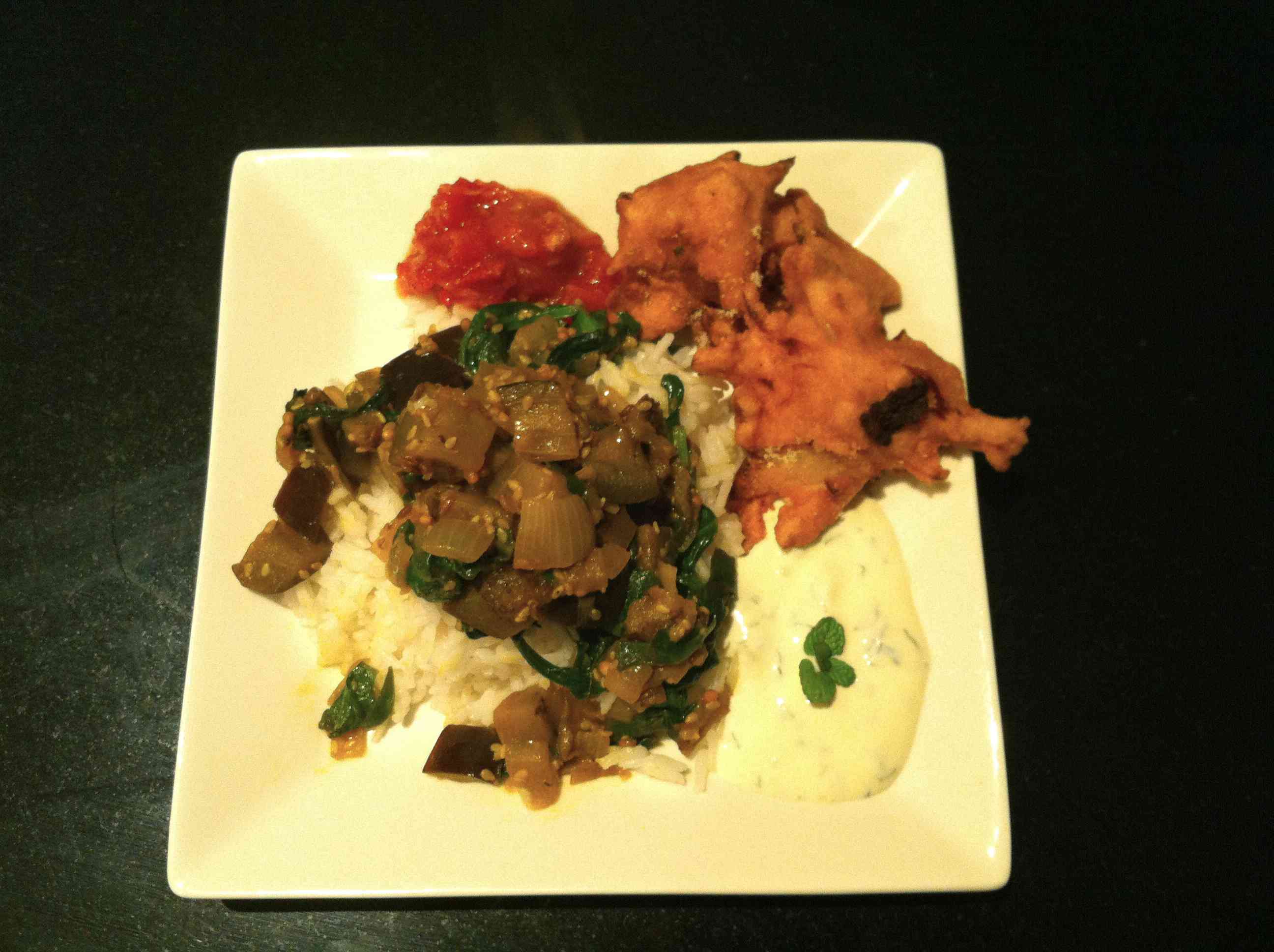 I got the recipe for the curry out of one of the original Vegetarian cookbooks – The Moosewood Cookbook. It is made up of mustard seeds (which pop in your mouth when you eat them), sesame seeds, tumeric and cayenne pepper. The spinach and tahini were my own addition.