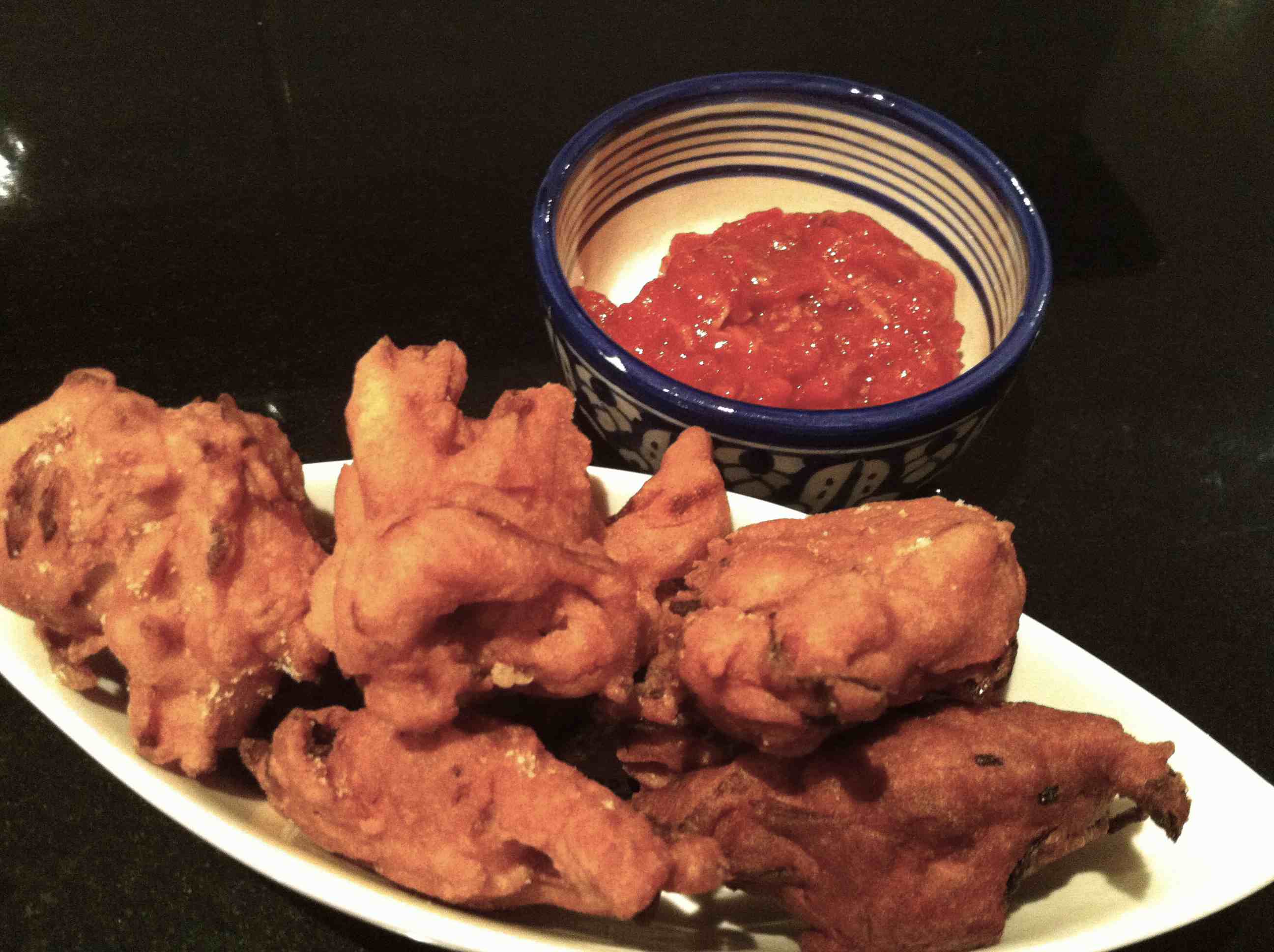 These beautiful light and fluffy onion bhajis are from a little inconsequential vegetarian cookbook requiring only 4 ingredients. Chickpea flour (also known as besean flour) provides a yummy nutty flavour that compliments the sweetness of cooked onion. It goes really fluffy when cooked which I particularly liked. Next time I will experiment with adding in some Indian-type flavours to spice ’em up a bit. The spicy sweet-and-sour relish is from the same book and which went perfect with the more basic version of these bhajis, as did a little minted yoghurt.