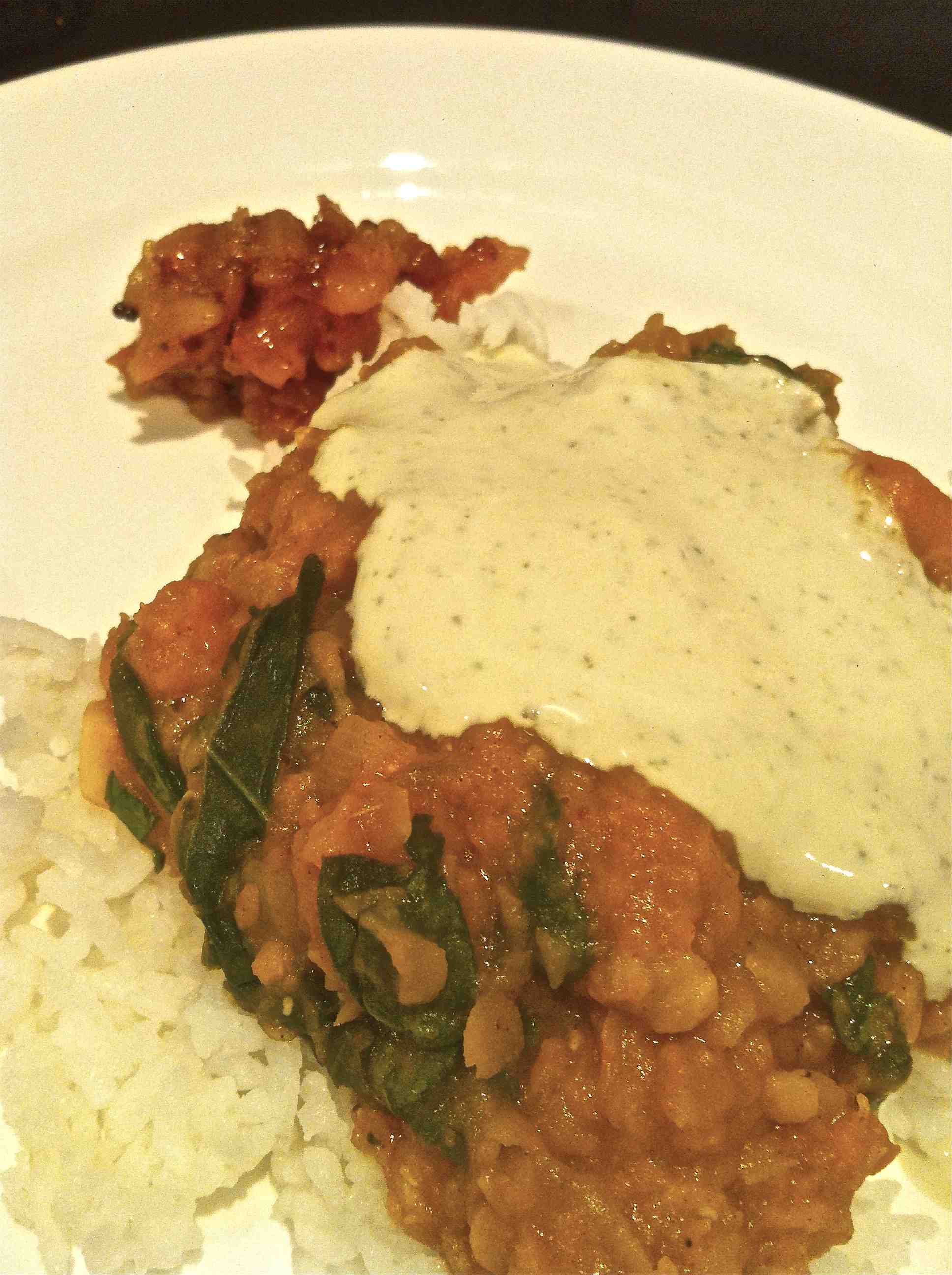 Pumpkin and Red Lentil Yellow Curry with Apricot Almond Chutney and Minted Coconut Yoghurt