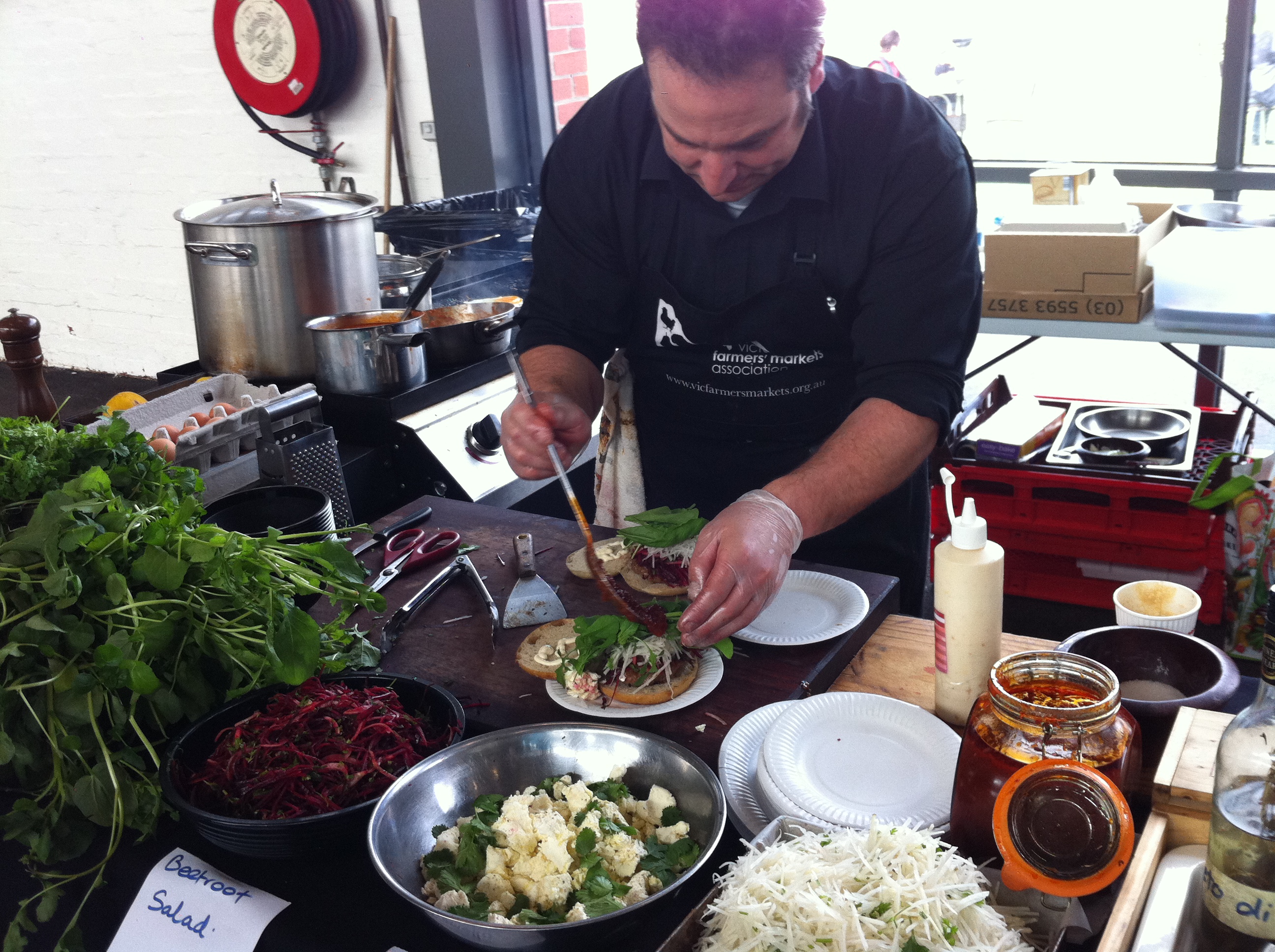 I love doing this challenge so much I actually look forward to getting up at 8.30 on a Sunday morning. I tell you, only organic, fresh, straight-from-the-farmer produce will get me out of bed that early on a day I don’t have to. It has also become a day that I spend some time with good friend Penny. Our routine now is to split one of the gorgeous market produce breakky hamburgers after our buy-up.