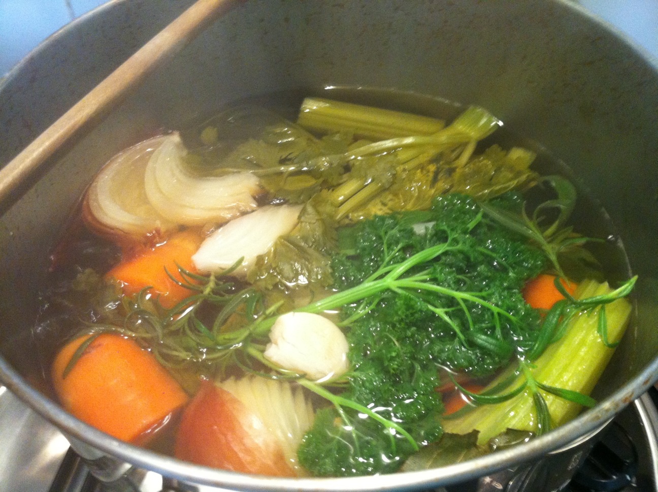 - Fill with water then add your flavourings such as carrot, celery (including leaves) cut into big chunks, a bunch of fresh parsley, thyme, rosemary, sage or other fresh herbs you have laying around, 5 peppercorns, 2 – 3 bay leaves.