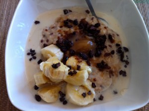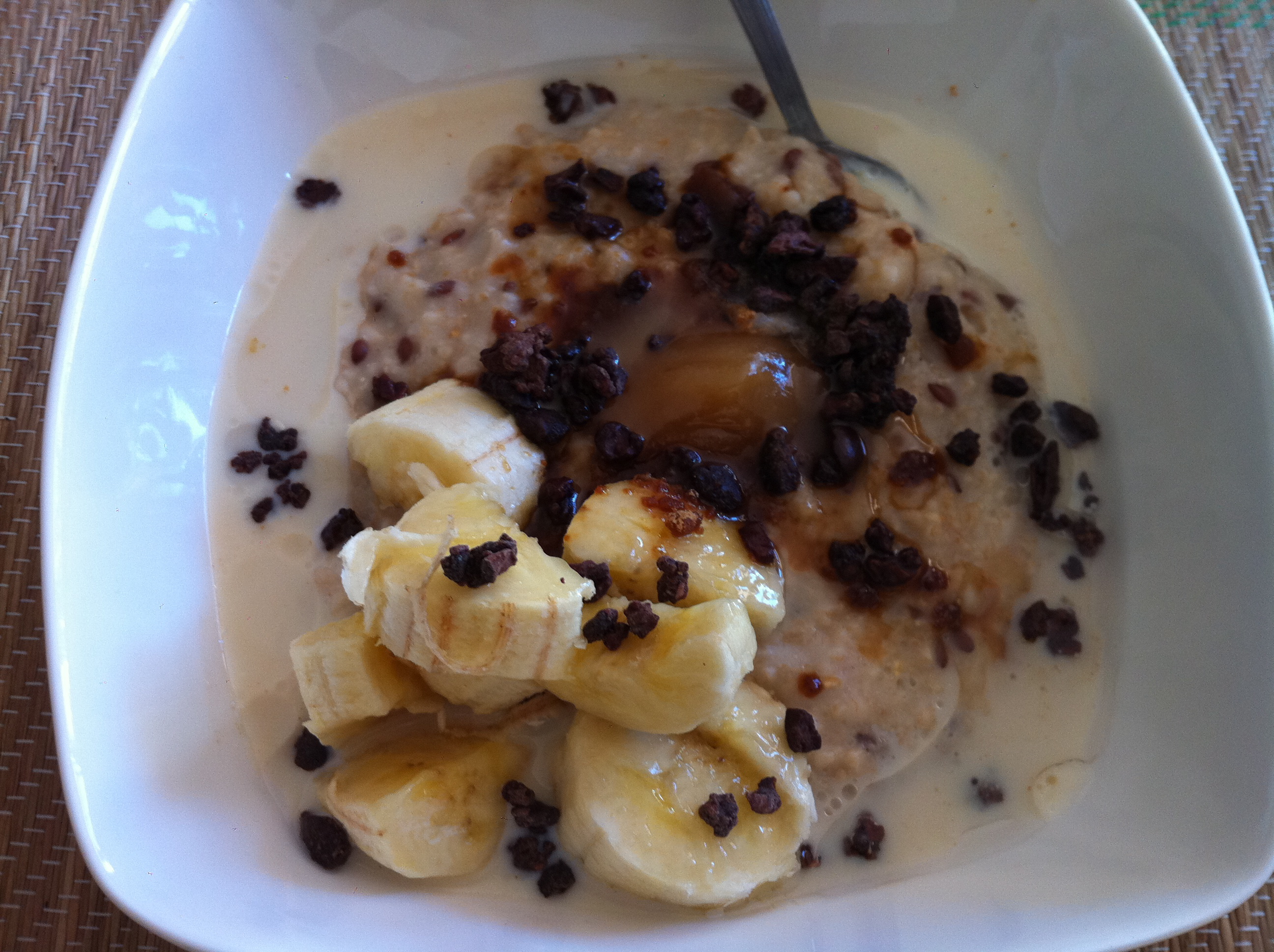 Cook up your oats with linseed as per usual. Once cooked, spoon into a bowl and dollop on a good tsp of organic coconut oil (good for so many things, internally and externally), a good spoonful of rapadura sugar and if you’re feeling particularly sweet-toothed a tsp of good quality raw honey, sliced banana, a sprinkle of cacao nibs (I bought the kind soaked in cane sugar) and add a slurp of bonsoy soy milk.