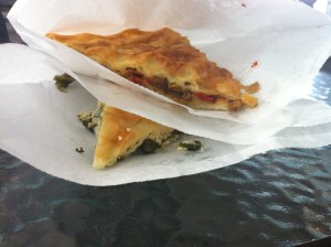 Penzo and I decided to take a break from the breakky burgers (to spread our business around) and we breakfasted on home made Borek; Eggplant/Capsicum and Spinach/Feta.