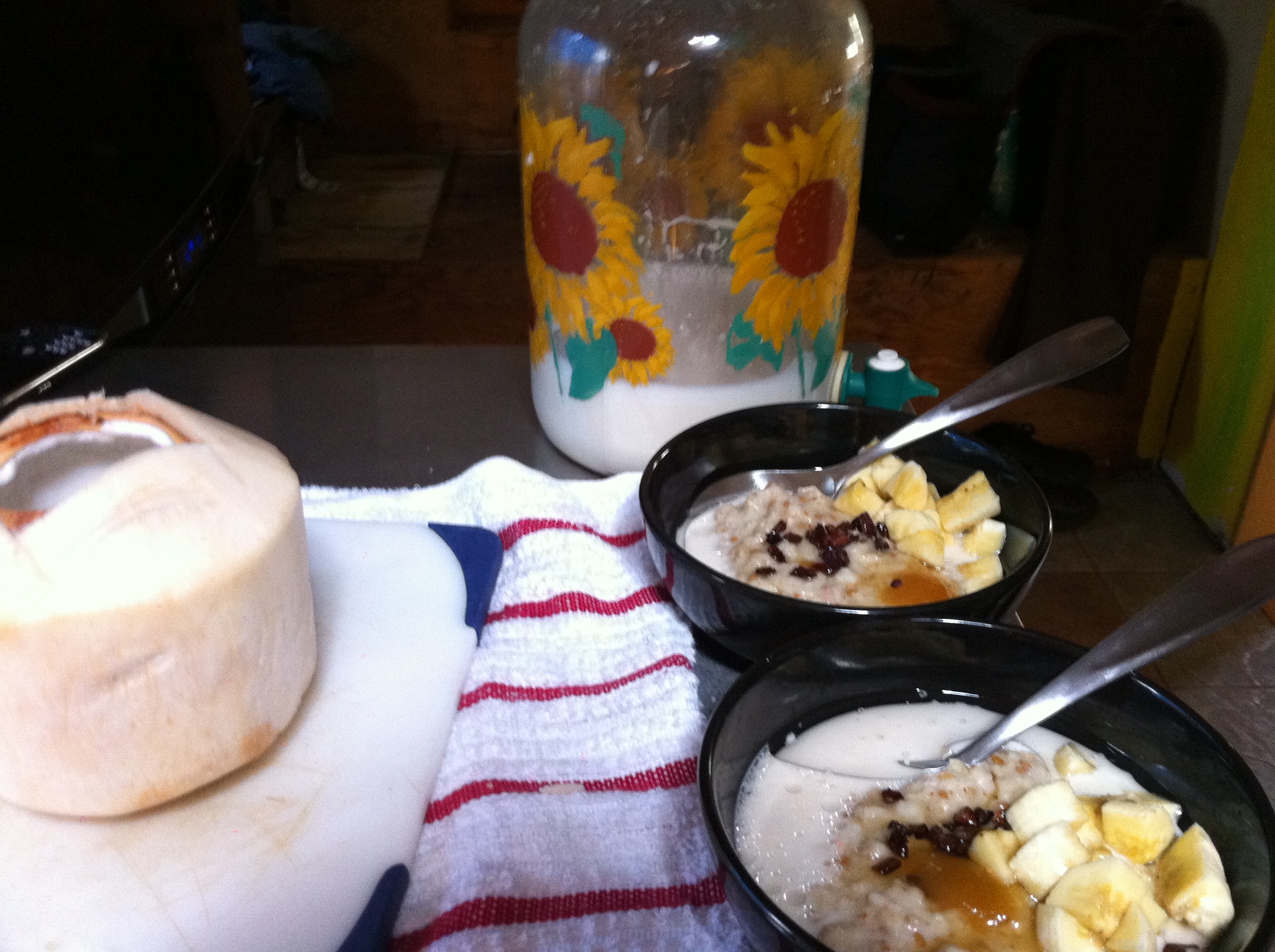 Earlier we’d shopped up an organic storm at Wholefoods and we whipped up the fancy pants breakfast, adding goji berries into the porridge. I couldn’t find rapadura sugar, so substituted with maple syrup. Since then, Big D and I are making a sweet combo of raw honey, maple and blackstrap molasses, adding a multi-dimensional flavour a whole host of beneficial nutritional properties (including iron in the blackstrap molasses) while satiating the sweet tooth without being too sickly.