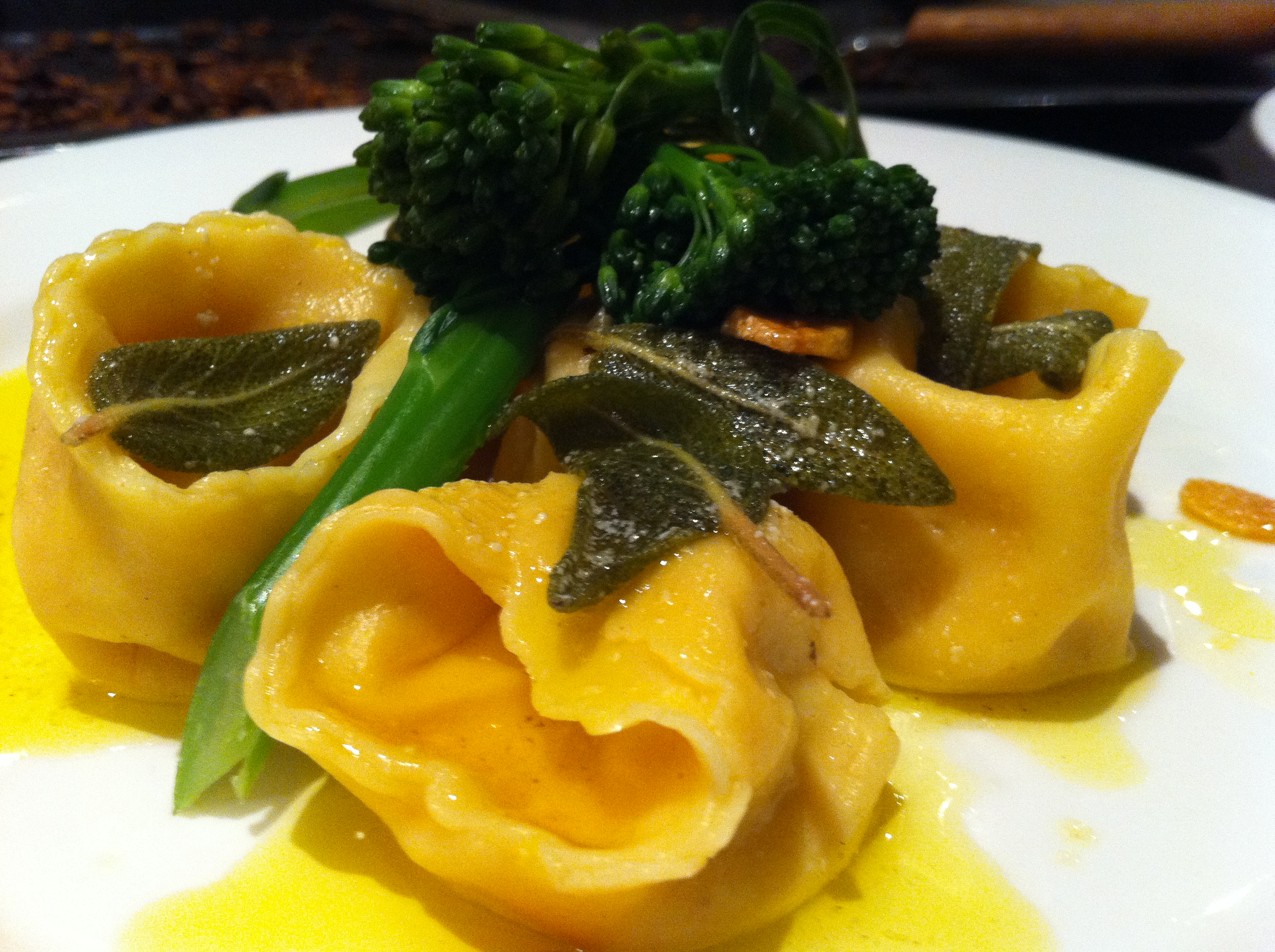 - Once tortellini is cooked spoon onto pre-warmed plates, add a spash of sauce, place broccolini on top and spoon over more sauce, making sure there’s plenty of sage leaves on each serving. Sprinkle with garlic chips.