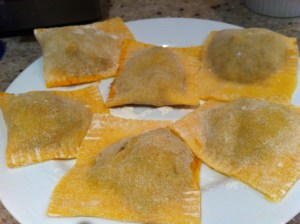 - Cook the agnolotti for approx 5 minutes – depending on how thick you rolled the pasta. Do this by gently poaching in softly simmering water. Use a spatula or similar to hold floating agnolotti under by resting it on top. The trick is to use a big pot, which we didn’t have available at the time of this making
