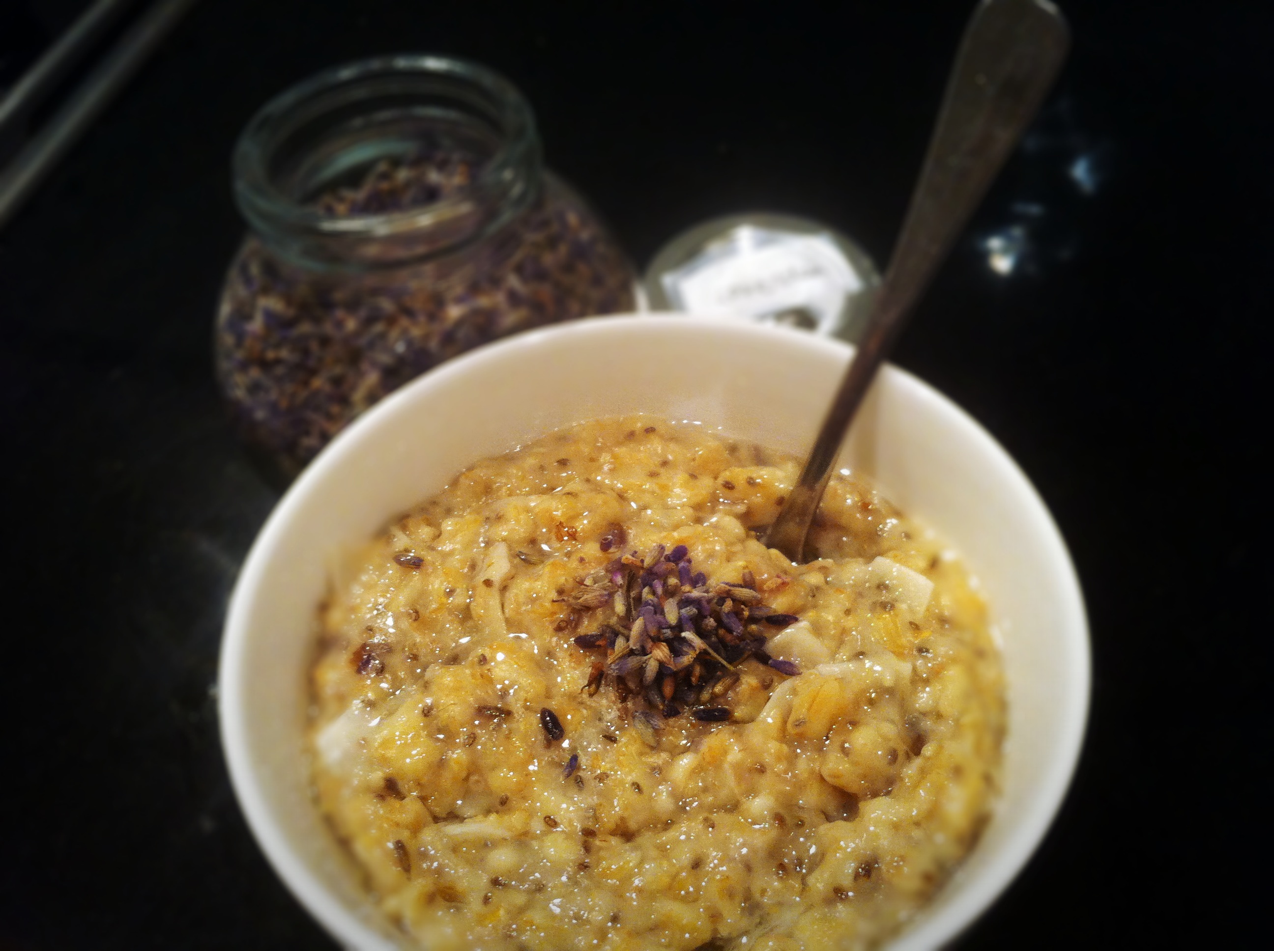 Cook the oatmeal (here and here), adding some fragrant and naturally sweet coconut shavings, some chia seeds for superfood content, and a pinch of dried lavender. Don’t go overboard or it’ll overpower your tastebuds. I even think some banana would compliment nicely.