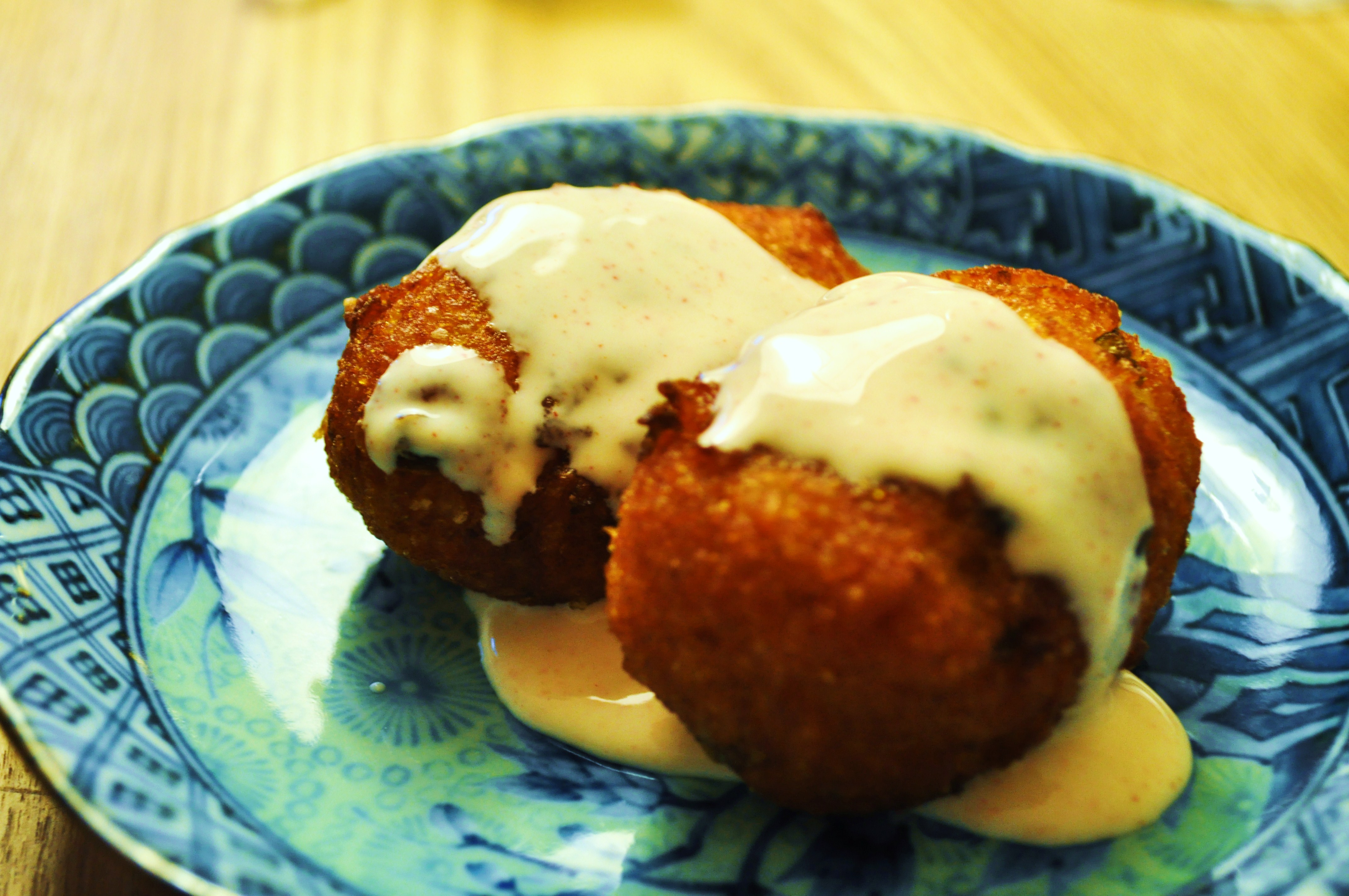 Chill mixture for 15 minutes, roll into walnut sized balls and poach for 25 minutes. They’ll swell considerably so you have a decent size ball as a result.