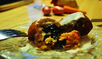 I stumbled upon kibbeh recently, which is a popular Arabian dish. Traditionally minced lamb is encased in a bulgur shell and either baked or fried. This recipe is even better IMO…and seasonally appropriate! Easily make this vegan if you’re so inclined, by substituting labne with tofutti (tofu cream cheese). One of my dinner guests exclaimed, “who misses the meat when you have flavours like these!”