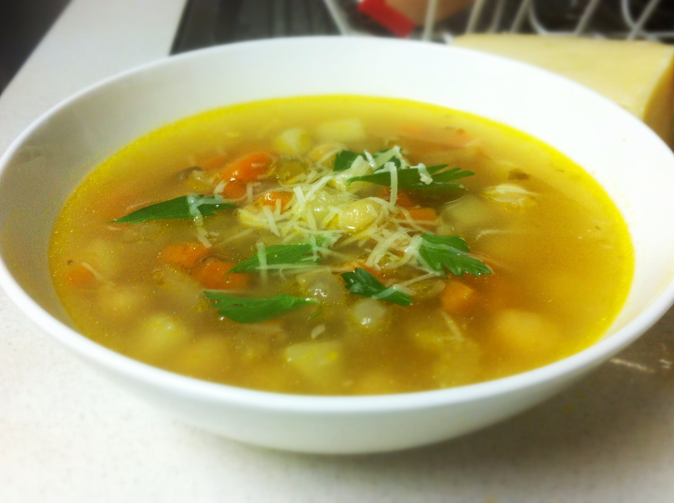 I really do like this soup. Like I said before, you could end wars with it. How can you go wrong with an aromatic base of onion, celery, carrot, fennel and garlic bathed in a savoury broth? Oh that’s right, if you add potatoes and parmesan rind you’ve just gone form naught to 100 on the flavour scale in about 20 minutes.